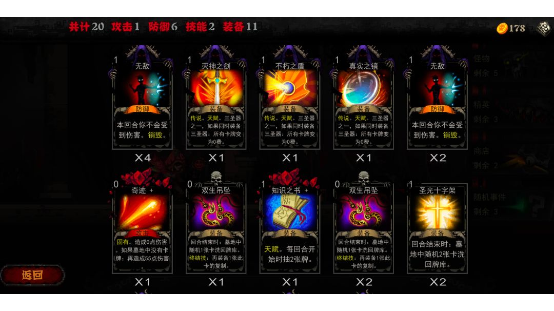 圣杯让我的牌不会被销毁,所以可以一直循环加护盾,等着时机成熟用翻倍加盾击秒死神 开始是攒了一堆牌,用冥想换了羽毛,100%闪避,顺便也解决了这个怪带穿透的问题 真巧又摸到个盾击(这时候就开始想攒防御秒死神) 然后就用掉了金属化,让防御翻倍 再用冥想把金属化从墓地里置换出来 虽然盾击被替换掉了,但100%的闪避给了我足够的时间 等摸到一些可以换卡或者抽卡的技能牌,迟早搞回盾击 刚好这个怪又可以成长,自动加血,以死神的伤害是绝对搞不死它的(就这还死神?) 🐶死神来收神了