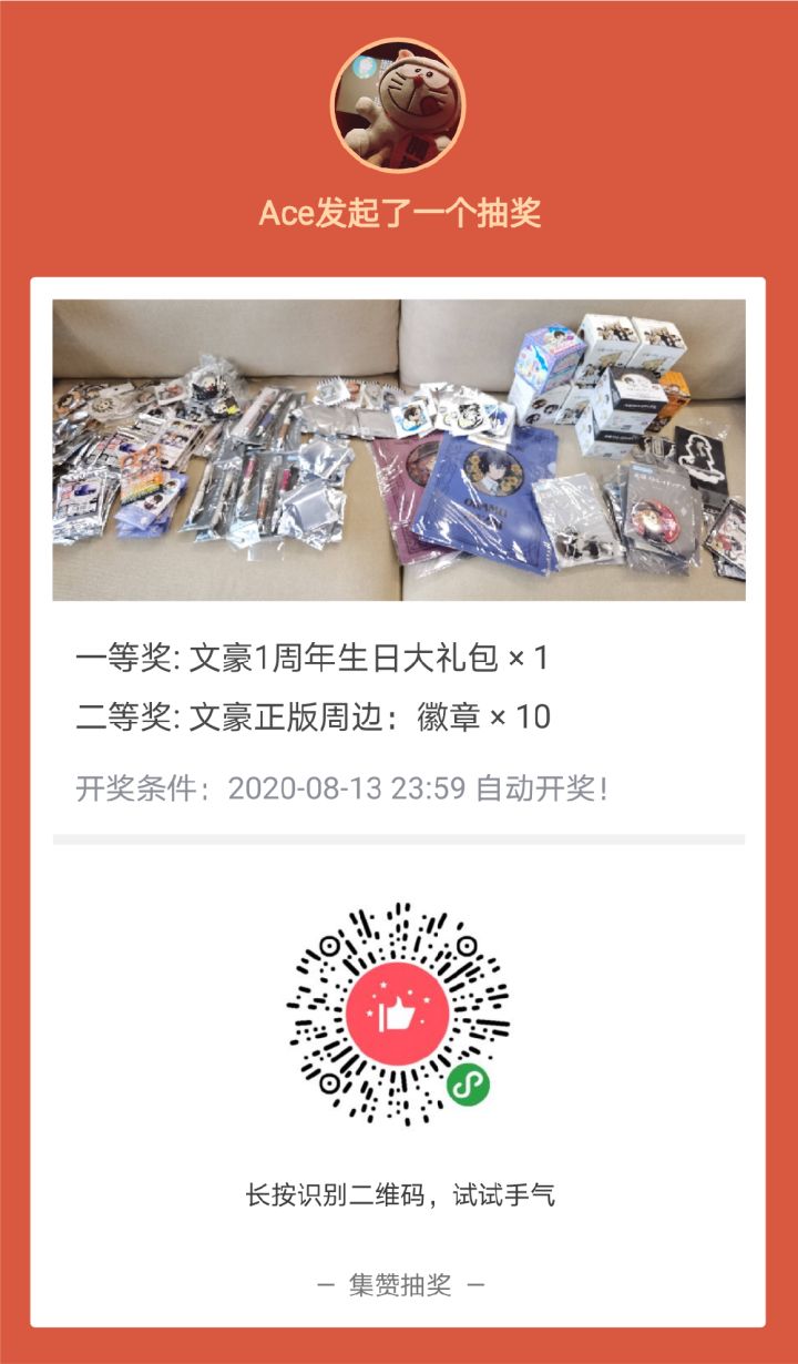 #文豪迷犬怪奇谭# #文豪迷犬怪奇谭1周年# #抽奖活动# 周年庆前两次的活动奖励已于今日发出,获奖玩家请注意查看快递噢~其他没有获奖的小伙伴请看这里↓↓↓官方真的是想尽办法趁机放送福利啦o(* ̄▽ ̄*)ブ识别下方小程序抽奖码即有机会获得正版周边哟!祝各位欧气满满!~~