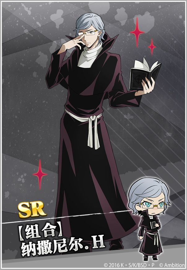 【组合】的成员。带着眼镜,穿着牧师的黑衣。对上帝有着狂热的信仰,用异能给与罪孽深重的人以审判。与玛格丽特一起,担负着保护组织的据点豪华客船的任务。队长技能:狂热信仰的牧师效果:苍属性的攻击力提高30%&异能球的体积变大5%。主动技能:给与罪孽深重的人以审判是我的使命效果:一回合之间,苍属性的攻击力提高100%。辅助技能1:敌人要来多少都可以效果:全消时触发。一回合,敌人造成的伤害降低6