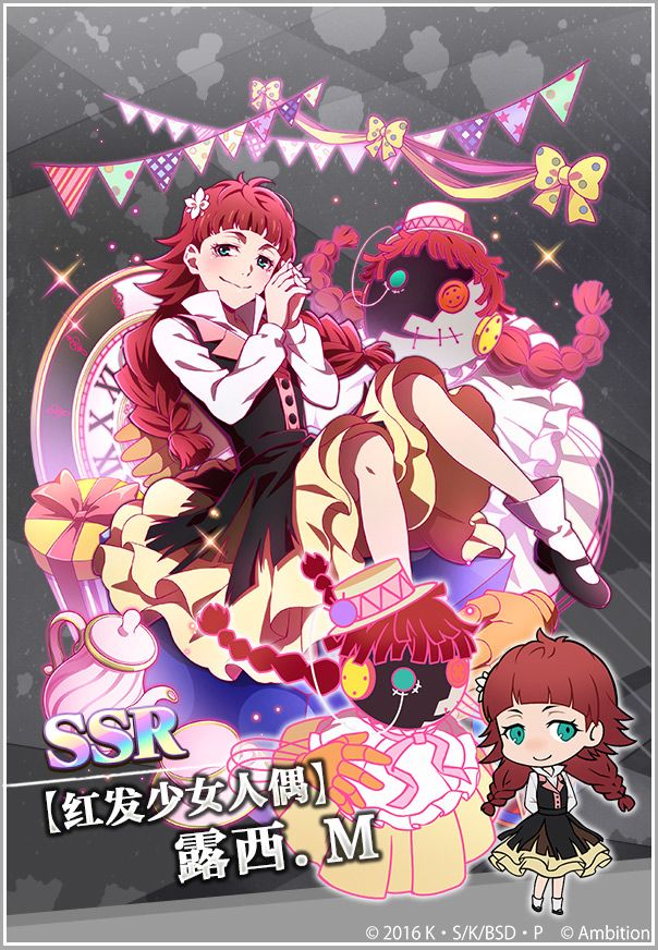 巨大的红发少女人偶.安妮和拥有制造出异世界空间【安妮的房间】异能的露西.M。 平时一副天真可爱的样子,但是一旦回想起在孤儿院生活的过去时会流露出寂寞的神情。队长技能:红发少女与异形人偶效果:红属性球的出现率更大幅度提高(大)&追击发动率提高30%。主动技能:嗯,安妮……谢谢你效果:两回合之间,红属性的攻击力提高120%&两回合之间,敌人造成的伤害降低25%。辅助技能1:安妮,要一直在一起
