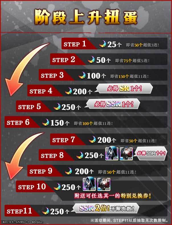 活动一:期间限定&阶段上升扭蛋:【化装舞会】江户川乱步、【化装舞会】福泽谕吉活动时间:11月4日13:00~11月19日12:59(16天)活动内容:参加化装舞会的江户川乱步和福泽谕吉,限定扭蛋登场!本次阶段上升扭蛋STEP3和STEP7时必得SSR角色1名,STEP5和STEP9时必得限定SSR【化装舞会】江户川乱步、SSR【化装舞会】福泽谕吉其中之一,STEP10以后SSR出现率