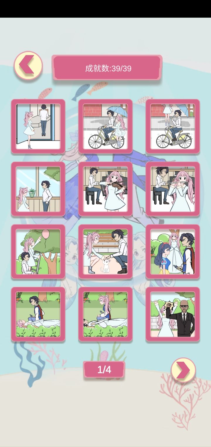 1.点窗户拿门禁卡刷门2.伞→女 自行车→男[自行车 伞→男]3.书桌里水杯拿到饮水机处接水浇盆栽4.去右边先拿书桌里的乐谱给女主看,拿小提琴给女主[窗台处有笛子,看乐谱吹笛子]5.把梯子拖动在右边树的分叉处,点击梯子中间6.捡起香肠和羽毛给猫咪,拿猫咪给女主7.拿书上的黑色苹果,箱子里(咱觉得是箱子)的水晶鞋和箱子旁边的镜子,镜子给左边的女孩,水晶鞋和毒苹果给女主8.拿毒苹果喂