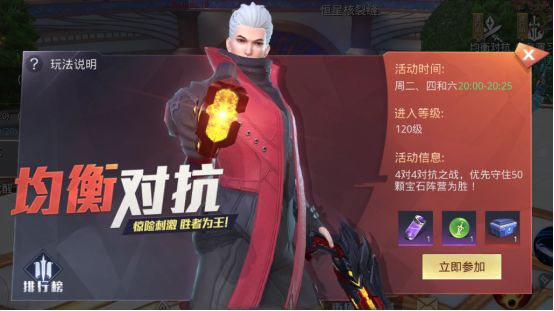 4 VS 4对抗之战,优先守住50颗宝石阵营为胜,惊险刺激,胜者为王!今天给小伙伴介绍一下均衡对抗的玩法! 胜利条件:战场内优先获得50颗宝石的阵营,并保持十秒倒计时即可获胜!若时间结束,则以宝石数高的阵容胜出! 进入活动场景后中部会不定时刷新宝石,拾取后增加阵营宝石,击败拥有宝石的敌人会爆出身上所以宝石,可通过界面左边快速查看队友和敌人的血量和当前拥有宝石的数量,点击旁边的“抢夺”即可自动追杀