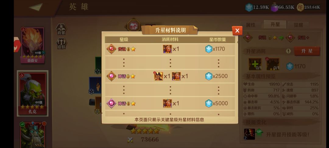下午好,本期给各位新来的老板们介绍一下英雄养成这块的玩法。 英雄升级 英雄升级所消耗的是圣水和金币,升级后的英雄在基础属性上会有更高的提升,也会变得更加强力。除此之外,所升等级有上限控制,当通过目标关卡时,升级上限便会提升。 英雄升星 在基础属性旁边,还会有一个升星选项用于提升英雄的品阶。当我们的英雄提升到一定品阶时,就会解锁更加强力的技能。通常情况下,升星英雄需要消耗星币以及同阵营英雄。 (部分