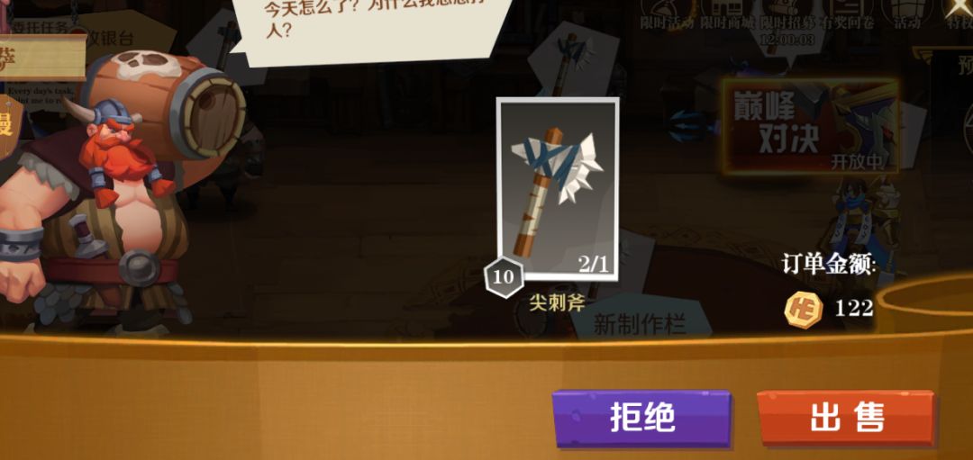 亲爱的工匠师们,本期我们将进行游戏玩法的又一介绍。废话不多说,我们赶紧开始吧! 1. 如何出售装备 当我们点击顾客头上所需求的装备时,会进入售卖窗口,此时我们仓库中拥有该顾客所需求的装备时,便可以直接售卖。 当我们未拥有顾客所需求的装备时,我们可以看到,出售按钮变为补货按钮,点击补货便可以选择自行制造或者拍卖行购取。每一个客人都会耐心的等待你将装备出售给他们才会离开,或者你拒绝他们。 2. 遇到