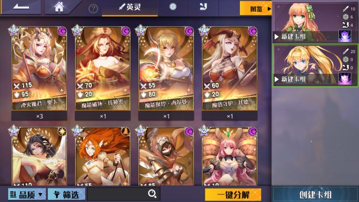 卡册:在卡册中可以查看自己已经拥有的卡牌(英灵、奥法、秘术),可以查看所有卡牌的图鉴。可以创建自己的卡组,每个卡组最少需拥有20张卡,最多可以携带40张卡。可以在卡册中对已经拥有的卡牌进行共鸣(在卡牌详情中),共鸣可以提升卡牌的攻防数值,更可以解锁或增强卡牌的技能效果。相关界面截图:圣堂在圣堂中可以进行抽卡,圣堂包含古典圣堂和冒险圣堂,各个圣堂中包含多个祷告室,选择祷告室后可以进行单次