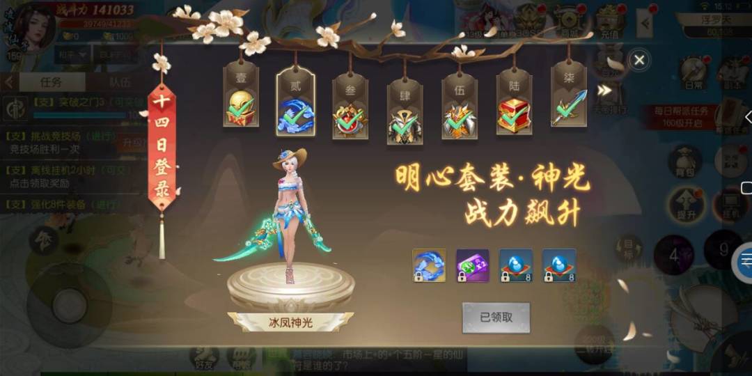 14天登录的奖励可以说是十分丰厚啦~ 有装备、神光、时装、灵石、丹药和玄兵等,还有稀有图鉴呢! 具体有哪些是比较重要的呢,来为大家分享一下!!《飞天魅影》14天登录活动奖励!! 一、第二天登录 冰凤神光——战力提升6300,生命+2100,闪避+70,韧性+70 二、第四天登录 夏日清波——战力提升4500,生命+1500,攻击+150,防御+100。 三、第五天登录 斩仙影甲——红装,六阶护甲,
