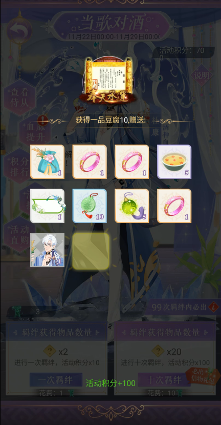1.全新活动【当歌对酒】将于11月22日至11月28日开放,参与活动即有机会获得侍从“杜康”及其信物“玉海杯”,解锁全新血统“酒神”!2.“杜康”是一名强力辅助侍从,侍从技能效果为:怒气值充满后将会清除全体队友所有负面状态,并对敌方造成伤害且降低敌方命中3.活动中可获得限定闪耀道具,可将特定立绘的半血酒神皇储/侍君变为闪耀状态,解锁立绘新效果4.新血统活动期间,御花园特聘血统中必有“酒神”血