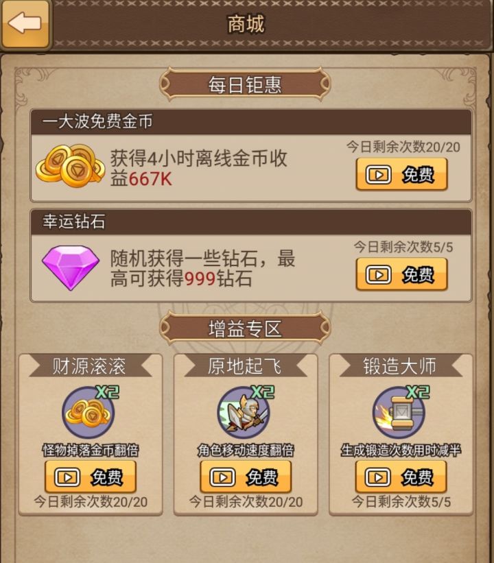 亲爱的勇者~12月11日版本已更新,更新内容如下:【新增】- 商城主界面右下方新增了完全免费的商城功能,每天都有机会获得大量金币、钻石和增益BUFF,每天都有机会获得999钻石哟!【优化】1.我们增加了解锁1-4级新装备的钻石奖励,帮助刚加入勇者大陆的玩家更好地体验游戏2.为了界面更加简洁美观,我们将锻造装备的按钮调整为锁定在锻造界面,提醒大家返回锻造界面需要点击左上角的返回图标哦!3.