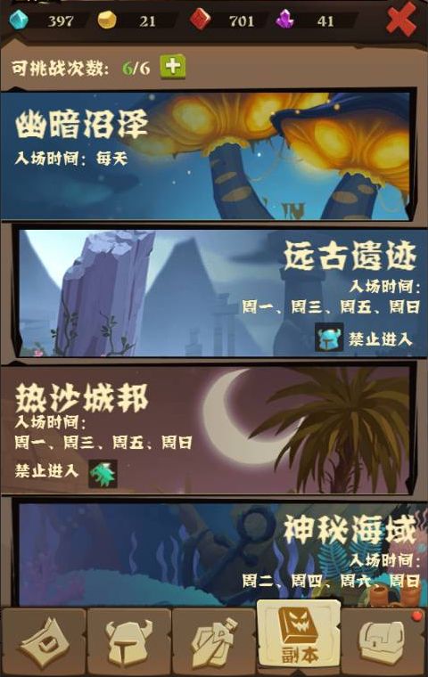副本是游戏资源产出的主要场所,目前游戏提供了四个副本:幽暗沼泽,远古遗迹,热血沙邦和神秘海域,每个副本都有特定的时间进入,以及禁止某些种族进入,有挑战次数限制,次数可以通过时间来刷新或者可以直接进行购买,最多购买20次,通过挑战不同的副本可以获得对应的材料,每个副本产出材料不同: