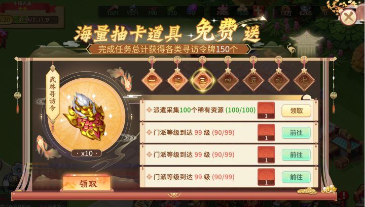 掌门大人下午好,我是福利大侠过儿~随着新版本的到来,武林迎来了全新的挑战与机遇。咱们的全民福利——七日目标,也迎来了全方位的升级,加入【武林寻访令】【侠客卡牌】等稀有道具。【武林寻访令】有别于以往的的寻访令牌,它拥有着聚集使用者“心愿之力”的特性,使用该特性,可大幅提高抽取目标侠客的概率,让你如欧皇附体一般连抽连中,带给你前所未有的劲爽抽卡体验!助你能在七日目标的加持下养成自己心仪的侠客在