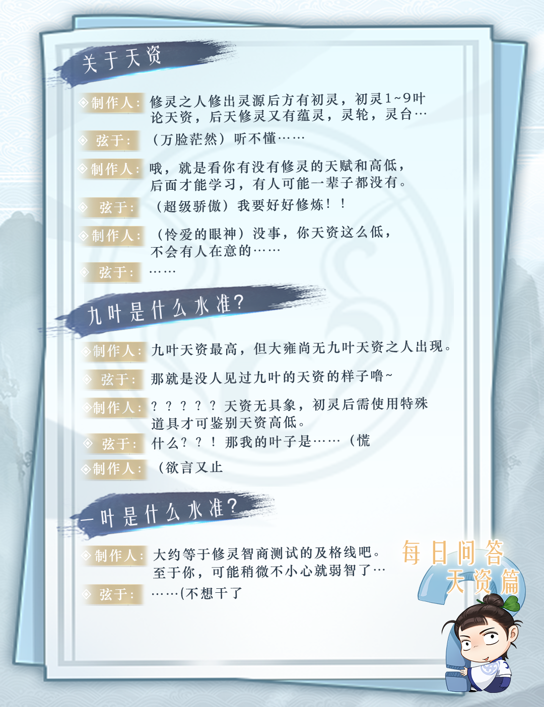 弦于刚刚和掌门大人见面的时候就被问到过:这当然是弟子的天资啦!在大雍,拥有天资才有资格修灵入得大道~这可是每一个修灵之人的必备之物!!但今天的百科是怎么回事……完全不懂惹……不懂不懂……
