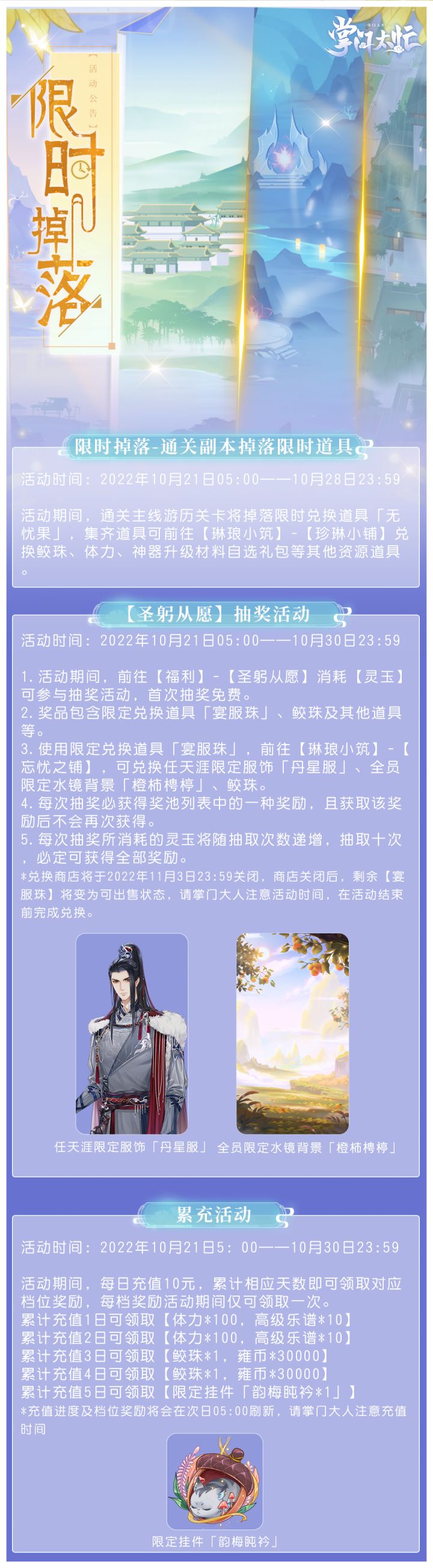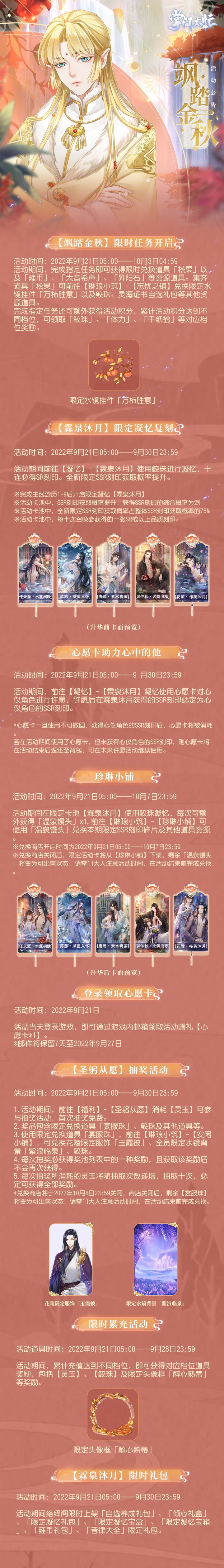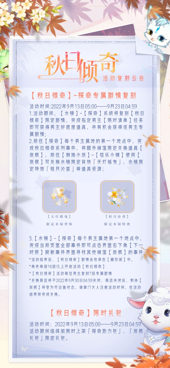 活动期间,完成指定任务即可获得限时兑换道具「松果」以及「雍币」、「大音希声」、「昇阳石」等资源道具。集齐道具「松果」可前往【琳琅小筑】-【忘忧之铺】兑换限定水镜挂件「万柿胜意」以及鲛珠、灵海证书自选礼包等其他资源道具。