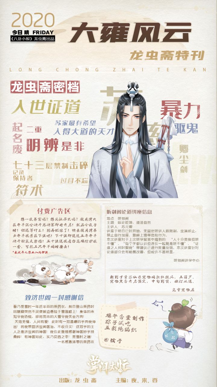 雍年六月十二日,天气晴没想到吧!惊不惊喜!意不意外!大雍风云居然提前一周来了!~掌门大人想不想康康哇,就在弟子手中哦~马上安排。本期迎来了苏仙长~苏仙长嘛,十三岁时问鼎问剑榜,一剑劈碎听剑阁的七十三层禁制,是苏家最有希望入得大道的天才。不过那个凝月湾牛羊决斗......弟子怎么觉得后背隐隐作痛......弟子是不是之前见证过什么......距离倾心测试还有一周时间啦~弟子为掌门