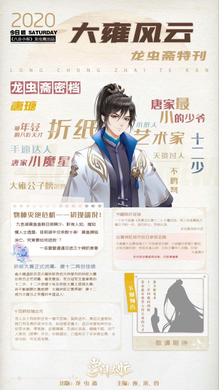 雍年六月六日,天气晴嗯?弟子并没有忘记什么事情哇?弟子昨天并没有收到什么大雍风云啊哈哈哈哈...... 弟子收到了。本期迎来了十二少~弟子才不是因为之前的一个雨天十二少挖了坑害弟子在里面泡了一晚上才藏起的了大雍风云呢~ 听说十二少是唐家百年难得的八叶天才,有钱又备受宠爱。这是什么话本里聪明又受宠的富家子弟形象哇!弟子也有叶子,未来可以拥有十二少八分之一的财富吗......十八分之