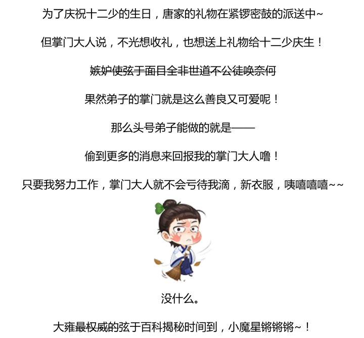 雍年五月三十日 天气晴听说过两天就是儿童节啦,小盆友是可以收到礼物哒!别的小盆友都有礼物,弟子的掌门大人也要有礼物才行!弟子这就去找制作组!不过弟子也是小盆友呢,是不是可以......(制作组:很好,现在出租你去隔壁街道扫地赚钱,到了儿童节就能收获一份历练。)弟子为掌门大人争取到了儿童节礼物,快来康康吧!【活动方式】掌门大人保存下方素材,在空白处填上对话,回复帖子并上传已填好词的图即