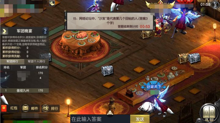 1. 军团活动:(1)军团晚宴:每周一、三、五20:00-20:15开启军团晚宴,不仅有一份美味佳肴还可以在活动内进行答题,参与答题并回答正确的成员将有可能获得稀有物品。活动结束后答题排名前三的成员可获得排名奖励,军团可获得军团宝箱,总之是一场不可错过的盛宴!(2)袭击匈奴:主公的等级达到45级后开启,并且加入军团才可参与活动。活动时间是每天10:00-22:00。袭击匈奴活动每天主公会有三次