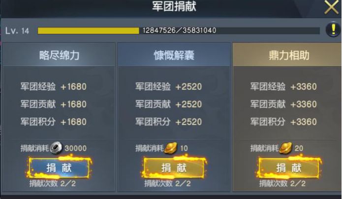当主公等级达到15级时即可开启“军团”功能,可以花费元宝创建或随机加入军团。拥有了骁勇善战的武将是成功的一半,一个好的军团是成功的另一半。主公可以通过军团获得大量资源和收益,同时也是需要军团成员的不断捐献,军团捐献分为不同档次,不同档次的捐献也是可以获得不同程度的军团经验、军团贡献、和军团积分。1. 军团经验:可以用来升级军团等级,军团等级提升可以增加军团人数和军团职位人数上限,职位越高可以