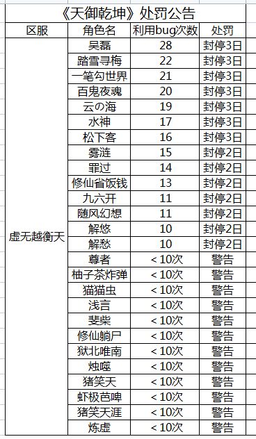 2、卡bug刷修为的问题,经团队大范围排查,有不少玩家在这段时间通过这个操作段时间获得大量修为,按情况的严重性进行封号处理,团队会尽快处理这个bug,同时这批玩家会被全部警告一次,如下次排查还存在卡bug操作将会永久封禁,具体处罚如下(封禁日期从6月30日00:00开始