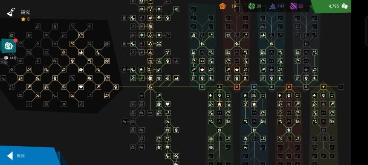 科技树暂且被各路大佬分成了四个区块,最左是星星区,需要靠主线解锁得到的星星去换,唯一好处就是不用去刷那堆让你抓狂的资源,但是需要绿钞啊,呜呜呜呜呜。然后偏中间一块,被分成了上下两块,上面是资源解锁区,大概就是。。。为了能更好的去增加剩下两个区块的增益而存在的,里面不仅有为了增益的资源而必须的挖矿机,还有临时能解救你的技能,更有一点点用的好送你上天用的不好顶多占你个位置的芯片,至于为什么说一点点。。。你去星星区翻一翻,就会发现,剩下一点点,就在星星区,别问我怎么知道的,我当初为了找一个芯片在资源区来来回回看了不下三遍,后面解锁星星的时候才发现一个相似的图案,然后。。。我当时人就傻了。