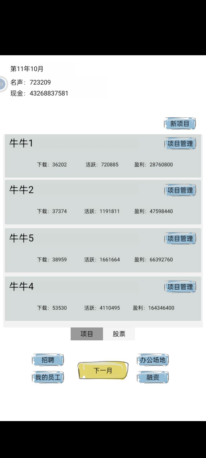 从入门到进阶,我把我会的统统告诉你。目前版本(2019.09.23)最全?攻略:第一步:招聘五个人才做第二个游戏(直接996别慌),没错就是全民XX招人要求:高级或者专家,优先程序高一点,疯狂刷新,一个月可以刷五次,如果最后一次人没齐不要慌,宁缺毋滥。(刷分如果没齐就重开吧)第二步:你现在有五个全民XX了。点开融资,等融资(第三个:钞能力)达到能卖一千万左右的时候,把办公场地(大胆升