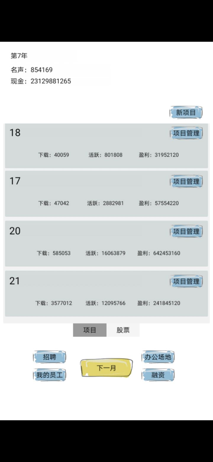 从入门到进阶,我把我会的统统告诉你。目前版本(2019.09.23)最全?攻略:第一步:招聘五个人才做第二个游戏(直接996别慌),没错就是全民XX招人要求:高级或者专家,优先程序高一点,疯狂刷新,一个月可以刷五次,如果最后一次人没齐不要慌,宁缺毋滥。(刷分如果没齐就重开吧)第二步:你现在有五个全民XX了。点开融资,等融资(第三个:钞能力)达到能卖一千万左右的时候,把办公场地(大胆升