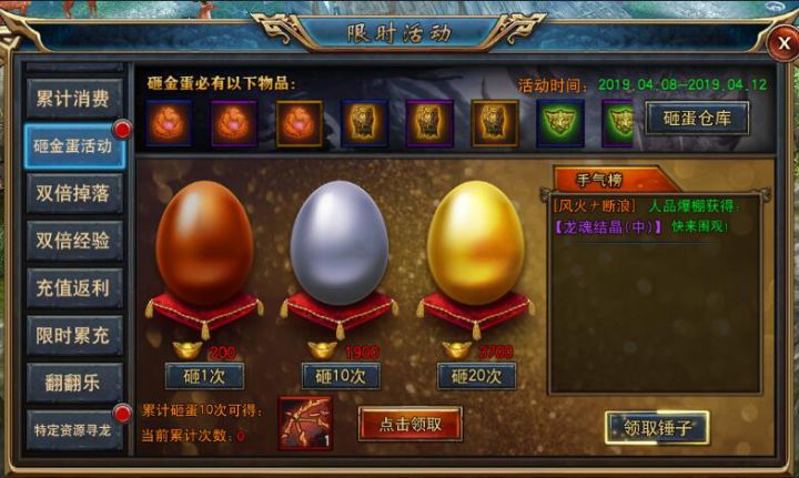 活动期间:2019.06.28活动对象:所有玩家活动说明:玩家在活动期间进行砸金蛋,可从3种不同的蛋中获取丰富奖励补充说明:累计砸蛋更有丰富奖励可以获得(每次砸蛋道具装备图鉴不同)