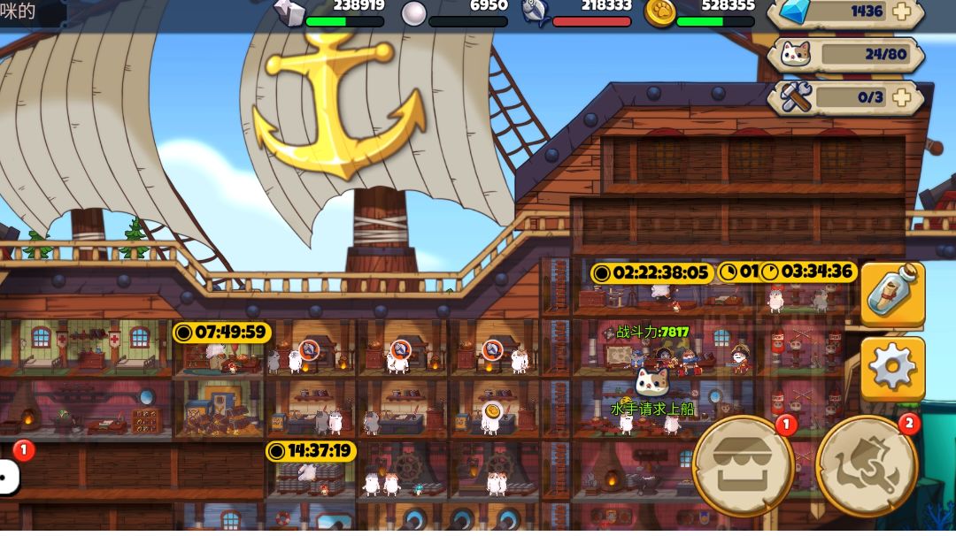 对本游戏稍有了解的铲屎官请看这里,某家有话说。 游戏的发展方向是什么?相信大家都有脉络,升级船长室,建造和升级高科技建筑。这时问题就来了,升级需要一段时间的等待,会有倒计时显示。但是随着等级越高,等待时间越长,而且船长室升级后,还有更多建筑等着升级,如何才能更有效升级哪?有几个小技巧和诸君分享。 第一个办法,买建筑工人。更多的建筑工人意味着你同时升级的建筑更多,你的升级效率就更高。 第一个建筑工