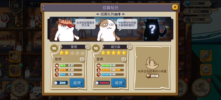 某家有幸参与游戏内测,略有所得,与诸君共享。几只机智的小猫咪,来到战舰上和铲屎官一起冒险的故事。除了初始喵(二星)外,都可以在船上的建筑物“酒馆”招募。品质从一星到五星,五星喵成长、属性最高。喵星人姓名、外貌、花色、星级都是随机的,想要招募到高星级的猫咪?你可以让自家猫咪到酒馆揽客,打工猫咪星级越高,羡慕到的猫咪越好,五星喵不是梦想。资源篇:本游戏目前有五种资源:金币、小鱼干、珍珠、铁锭、钻