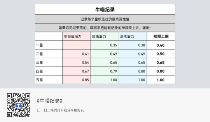 喵咪可以花珍珠升星,提升潜力,进而提高属性(同等级下属性只与潜力相关)。保留有培养价值的低星猫就很重要了~本指南将让你直观看到:* 各星级喵咪的最高潜力值;* 怎样推算喵咪升星后的潜力值;* 怎样的喵咪值得保留和培养。——————————————喵咪最高潜力值经过一段时间群友的共同努力,整理了见到的喵咪最高潜力值属性,如下图(随时不定期更新,若你见到合适的,也欢迎来修润文档)预期