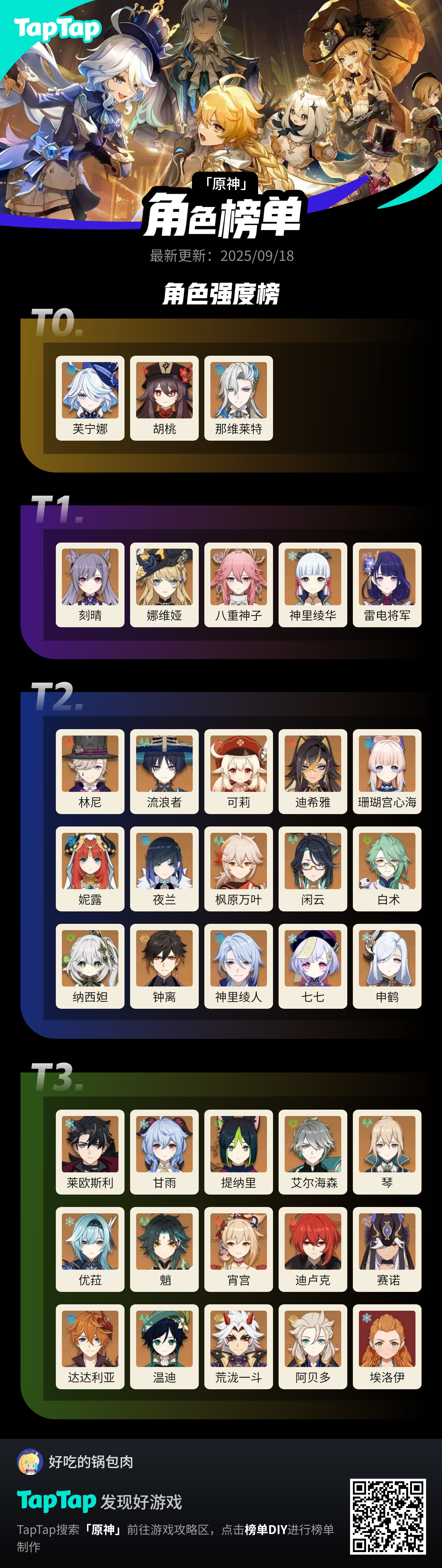 UID 105298742 哈喽大家好我是澈晓~ 今天为大家带来1.6版本的全角色评级推荐与配装推荐!前两天枫原万叶上线之后,立马就和砂糖打了一架,打了两天也没有消停,反而有些愈演愈烈的趋势。本次攻略为大家带来更新之后的全角色评级配装推荐,以及个人对万叶的心得体会。 本次推荐表的调整内容大致如下: 1. 对于角色评级划分描述稍作修改,以前的S评价为T1,现在是T0.5,后续依次顺延,这样修改有利于