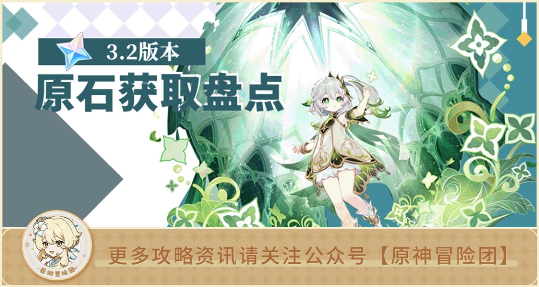 3.2版本终于要更新了,我们根据已有的信息对3.2版本获得的原石数量进行了计算,每部分还有详细依据,方便大家心中有数。 统计范围从11月2号版本更新开始,以前瞻直播里版本持续35天进行计算,纳西妲&宵宫池,八重神子&达达利亚池情况也分别进行了统计,月卡/纪行作为一个可选项列在表中。 未知成就等难以统一的部分未列入表中,所以预计大家实际能够获取的原石数量会比统计数高一些。 一、相关说明 1、统计时深