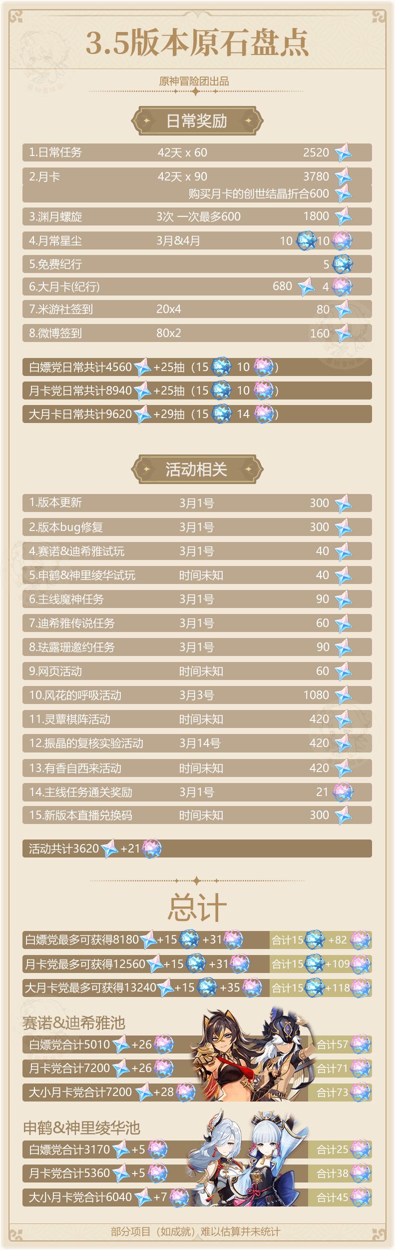 3.5版本原石统计 竟然拿的比3.4版本还多! 1、统计时深境螺旋按照全部满星来计算,如果有小伙伴无法满星可以根据自身情况减掉对应的数量。 2、3月1号版本更新,在统计中3月和4月的星辰商店作为项目参与统计。3.6版本直播的300原石兑换码放出时还在3.5版本,因此也计算到统计中。 3、各种游戏外社区签到途径获取原石我们只保留了最为稳定的米游社和微博,其他平台收益并不稳定,因此不再参与统计。每个版