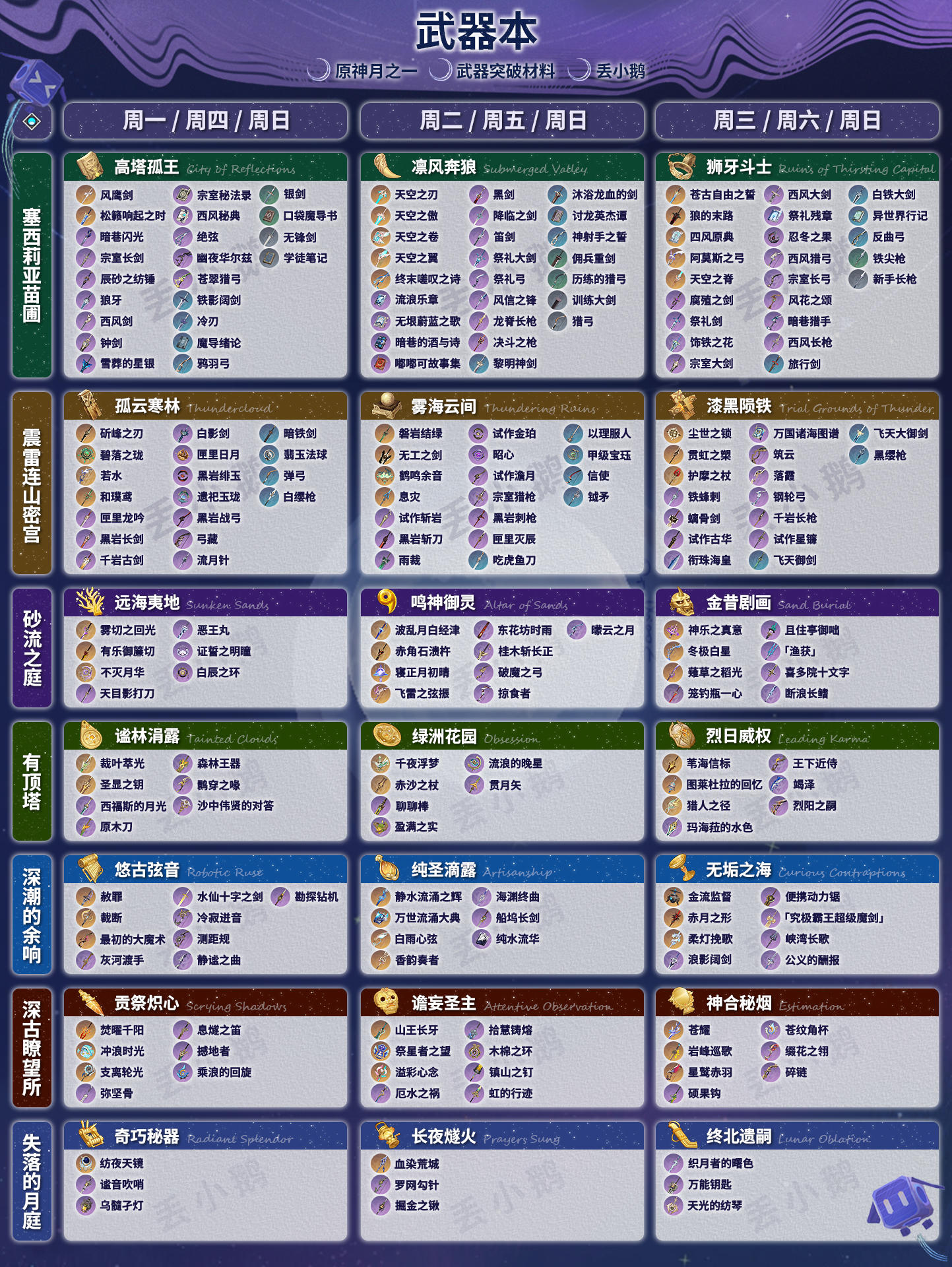 UID:220052599 旅行者,你来啦~ 我是丢小鹅,为你带来【原神5.4】上半Up武器突破材料~ 【原神5.4】上半Up武器 ⭐️5星武器:「法器·寝正月初晴」、「弓·白雨心弦」 ⭐️4星武器:「双手剑·恶王丸」、「长柄武器·断浪长鳍」、「弓·曚云之月」、「单手剑·笛剑」、「法器·昭心」 #原神 #原神攻略 #原神创作者激励计划 #梦间见月明 #寝正月初晴 #白雨心弦
