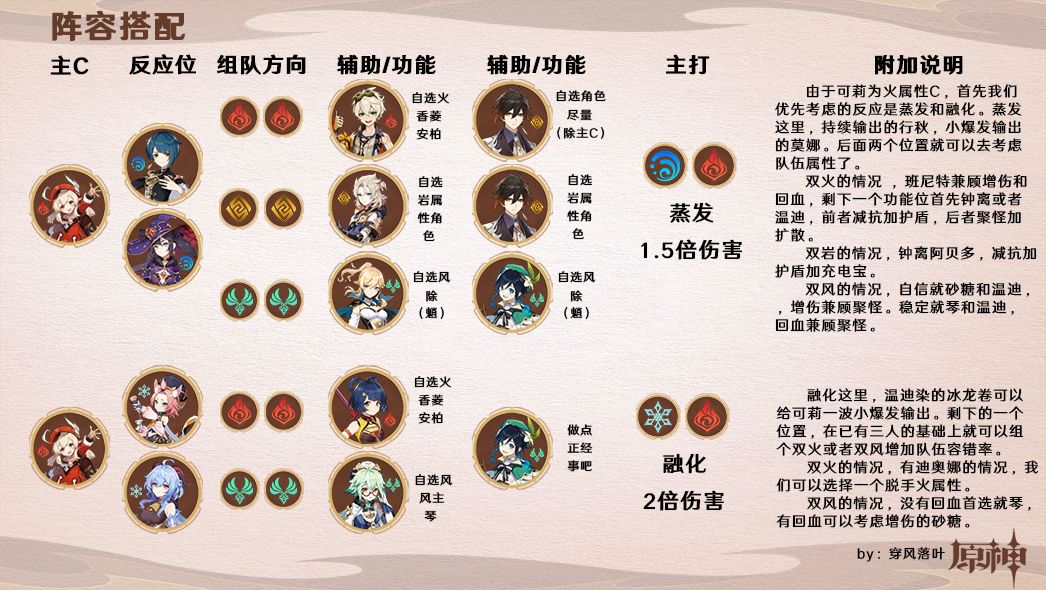 大家好!我又回来了,在大家还是很多配队的疑问下,这次就首先上一期关于可莉的配队,听听大家对这样配队的声音 (还是复杂了?)(接受?)(更好?) 首先简单说一下思路,就是以简单的“主C+反应位”为基础的填补式搭配,为了照顾大部分玩家,图上列举的出来的搭配为较好成熟的搭配,大家看着自己手上有的角色,可以自行的选择添补,而后面有自选的搭配,这里就为了照顾到可能还没有特定角色的玩家,这里的自选个别还是范围
