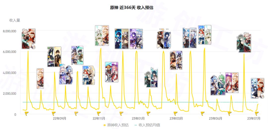 哈喽坊宝子们,“千呼万唤始出来”的复刻选手优菈你抽了吗?还是更想抽嘟嘟可的好朋友可莉呢?优菈&可莉两位老朋友的卡池前两日的战绩如何呢?坊坊结合七麦、点点、蝉大师等数据统计网站的原神预估收入进行统计,整理出了原神一年内卡池走向图以及开服至今各卡池前两日流水的收益排行,由于数据为流水预估,因此仅供参考。【原神一年内收入折线图】 整体来看,一年来纳西妲、雷神、胡桃、神里、夜兰、魈、万叶的热度相比其他角色