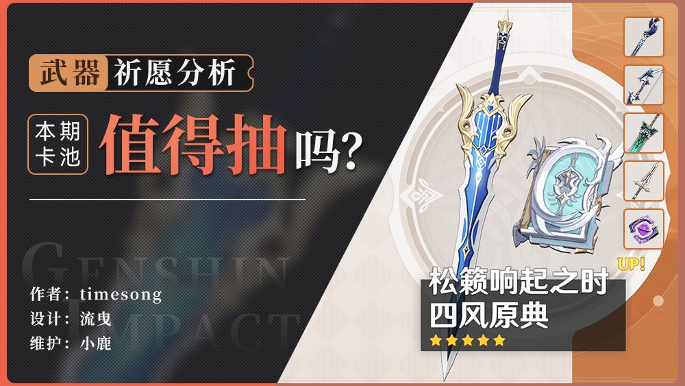 本文为TapTap首发,严禁转载。 本期攻略为新卡池2把五星武器和5把四星武器的抽取建议和使用指南,希望对你有所帮助。 一:五星武器 1、松籁响起之时 抽取建议: 主玩物理主C玩法的优菈玩家可以考虑抽取。不仅伤害方面,松籁响起之时的伤害最高,还有跟优菈的外观配合也吊打其他双手剑。 2、四风原典 抽取建议: 四风原典是常驻五星武器,可以在武器池和常驻池中歪出来。虽然它的泛用性很高,强度也不低,但