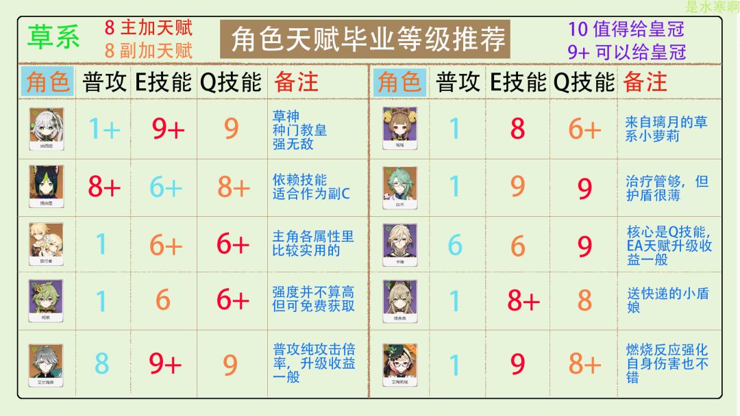 UID:130737586 大家好啊,这里是水寒。旅途马上就要踏入火之国了,想起这系列攻略好久没更了,趁此机会更新一下后续新加入的角色。 皇冠,也就是智识之冕,用于给角色天赋升满级时用。皇冠是这个游戏里最稀缺的资源之一,基本上一个版本就只能获取1-2个。所以对于前中期的玩家,使用上不能太浪费了,谨慎为好。 对于老玩家,资源很充足了,皇冠的使用上可以不必那么谨慎,根据自己的喜好来就行。本系列攻