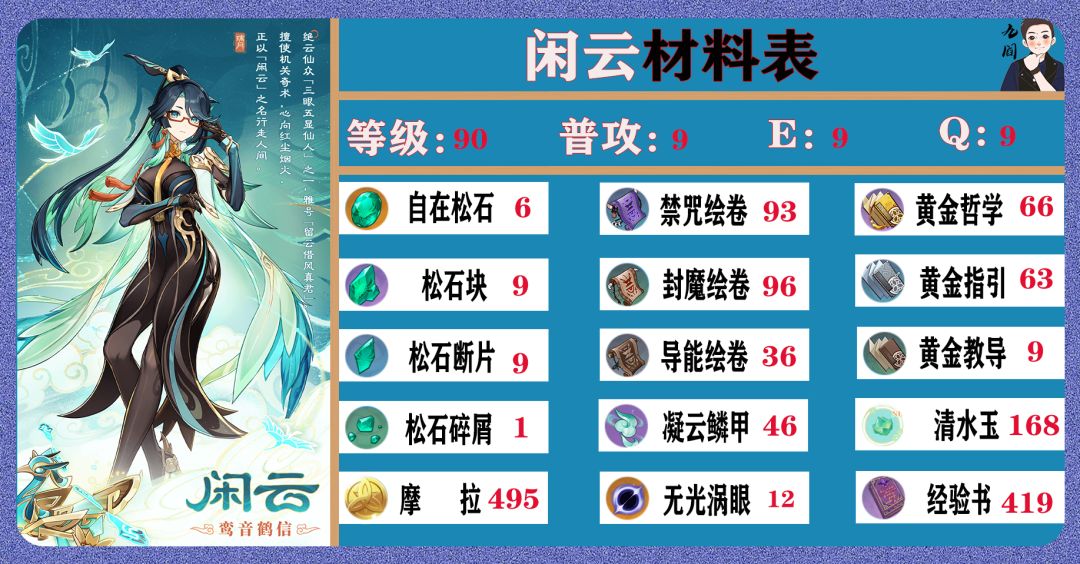 UID:191729507 各位旅行者海灯节好呀!随着4.4版本的到来,咱们不光迎来了新地图、新魔物,也迎来了我们的老朋友、新面孔——闲云~ 就让花花带大家一同深入了解那个女人的养成材料、技能机制、加点建议、武器推荐和实战配队吧! 【目录】 角色概览 养成材料 技能机制 武器推荐 套装词条 实战配队 闲云是一名风元素法器角色,定位是群体治疗&下落特化辅助。她的技能特点是元素战技大量产球,元素爆发大
