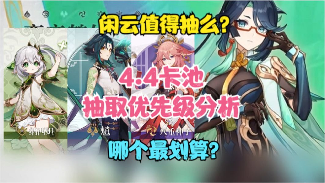 各位旅行者大家好,我是澈晓。 原神4.4版本的前瞻已经落下帷幕,根据昨日的前瞻内容,我们已经能够得知海灯节版本的卡池信息。上半为新角色闲云和草神纳西妲复刻,下半为魈和八重神子复刻,其中我们需要关注的重心刚好就在上半卡池。 那么4.4版本卡池的质量如何?到底抽谁更保值?本期将会和大家讨论4.4版本的四位5星UP角色,以最贴合版本与未来发展的视角,为大家的抽取提供合理的建议与规划。 【省流】 4.