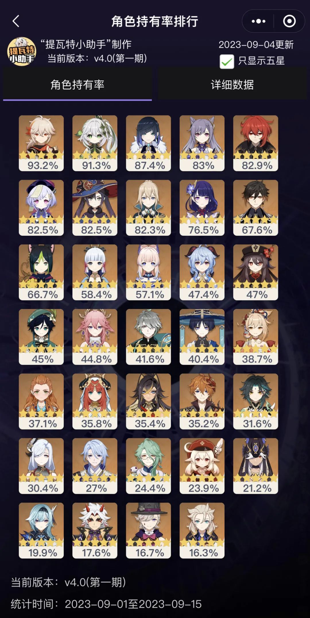 原神从开服到现在已经推出了非常多的五星角色,相信不少玩家很好奇哪些五星角色的持有率最高?哪些是最稀有的五星角色?今天Z哥就来带大家来一起看看。 下图是截止4.0上半林尼&夜兰卡池开放后的最新的五星角色持有率排行: 角色的持有率 = 持有该角色玩家总数/参与调查的玩家总数 需要说明的是本数据非官方数据,是来源于深渊12层满星用户上传的数据, 在样本上总体来说还是较高练度的强度党玩家为主,角色的持有率