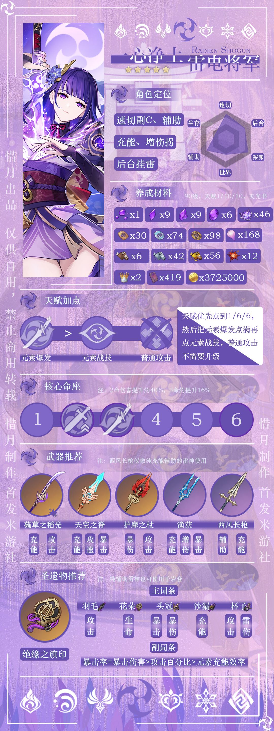 UID:100634645 【目录】 -角色定位-天赋介绍 -命座分析 -圣遗物选择 --攻击杯or雷伤杯 -武器选择 --抽命座or抽武器精炼 -队伍推荐 【角色定位】 官方对雷电将军的定位是一位强化队伍元素爆发威力的辅助型角色,实际她的定位非常灵活,除了能为队伍带来元素爆发增伤以及群体充能之外,还能有着非常不错的短期输出能力,能够提高队伍伤害的下限,解决队伍因充能问题导致的输出低谷,加快全队输