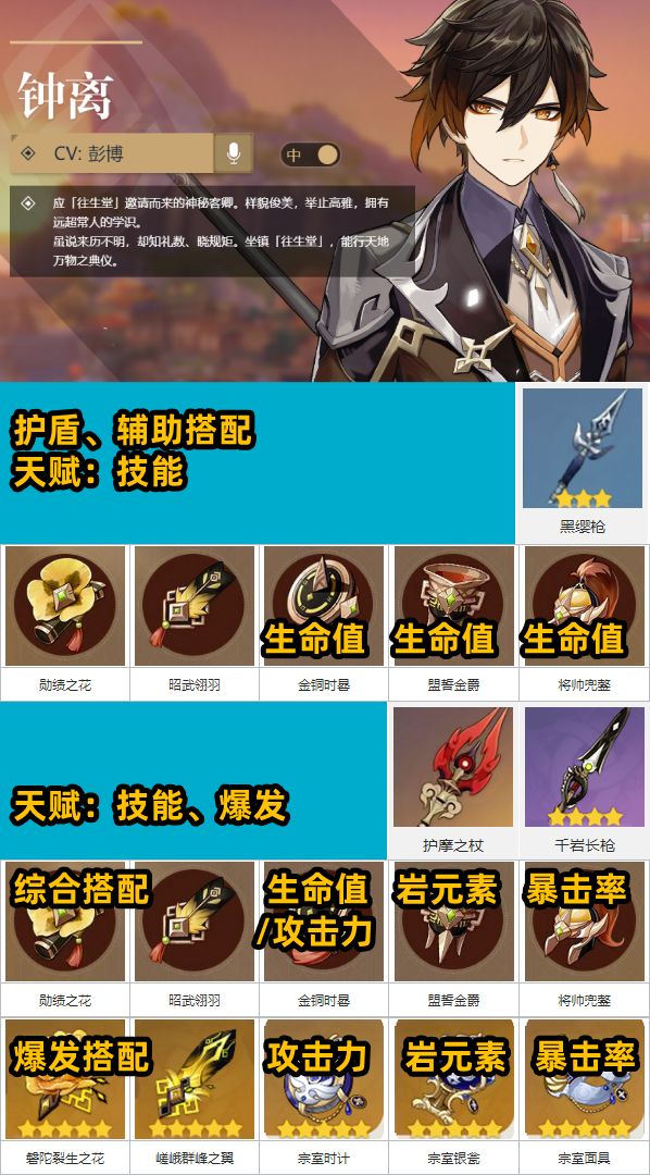 养成推荐: 定位冰系辅助,提供护盾保护和治疗续航,能够搭配大多数配队 主词条推荐: 时之沙:生命加成/元素充能 空之杯:生命加成 理之冠:生命加成/治疗加成 副词条:生命加成/元素充能 天赋加点推荐: 优先加点元素战技(E)保证盾的厚度,适当加点元素爆发(Q)提高治疗量 适用阵容: 1.比较适合双冰永冻和雷冰超导物理队,在增幅反应队也有不错的实战表现 2.除钟离以外,应该算是泛用性最高的盾位角色了