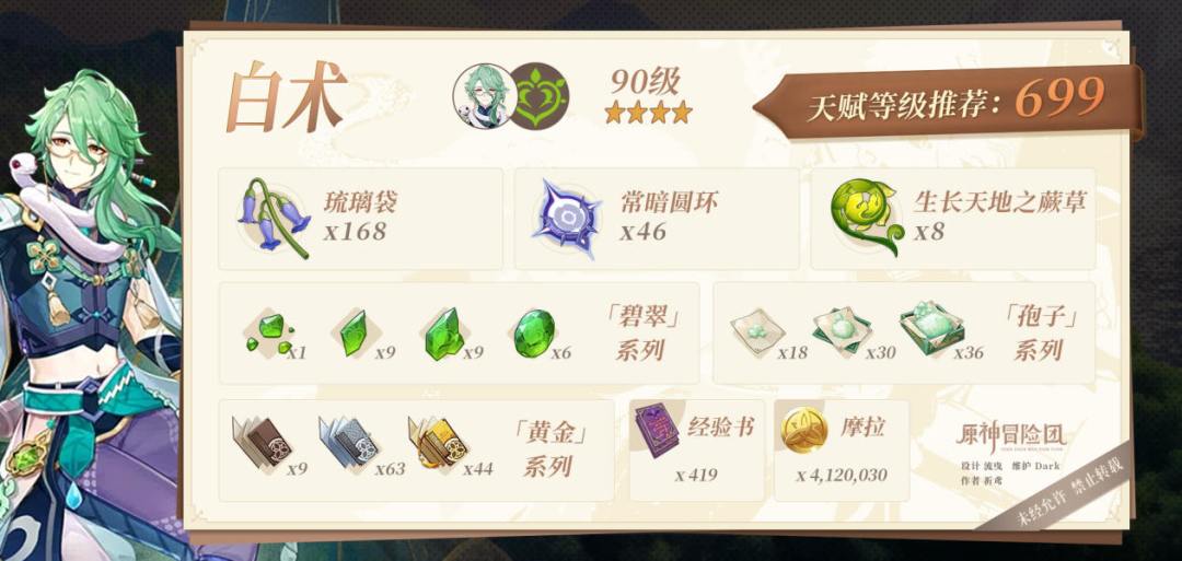 UID:185889661 hi各位旅行者们大家早上中午晚上好呀,这里是为大家带来版本角色攻略的青枫 本期为大家整理「白术」的角色攻略,他是药庐「不卜庐」的主人,随身悬着名为「长生」的白蛇。精于药石,深于城府。接下来以图鉴的形式简要解析「白术」的养成参考,帮助大家快速了解角色及后续培养方向; ▌养成图鉴 文案 设计&编排 ▌养成耗材统计 ●本帖为角色图鉴攻略,每个版本都会整理优化,关注我及时领取
