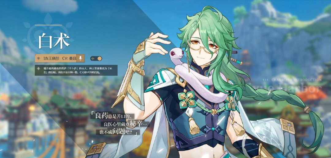 旅行者们好呀!今天为大家介绍的角色是白术。 他是药庐「不卜庐」的主人,随身悬着名为「长生」的白蛇。精于药石,深于城府。