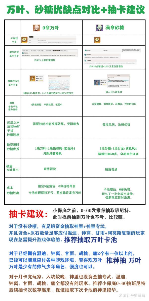 (搬运/侵删)一图流直观对比,万叶与砂糖优缺点分析+抽卡建议