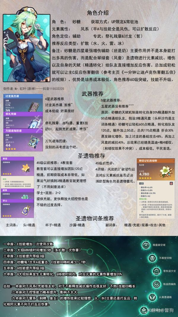 圣遗物选择4风套加成风系和减抗效果。 主属性推荐选择精精精 副属性优先选择:精通,充能 其次选择:攻击,暴击,爆伤(暴击40以上情况可选,否则意义不大) 砂糖给予队友精通属性,而最能吸收精通属性的角色有:八重,早柚 八重天赋携带:每点元素精通增加小技能造成的伤害 早柚:在场上触发扩散时,为附近的所有角色恢复300点生命,每点元素精通额外回复1.2生命 早柚6命:早柚精通增加大招攻击力和回复量 (早