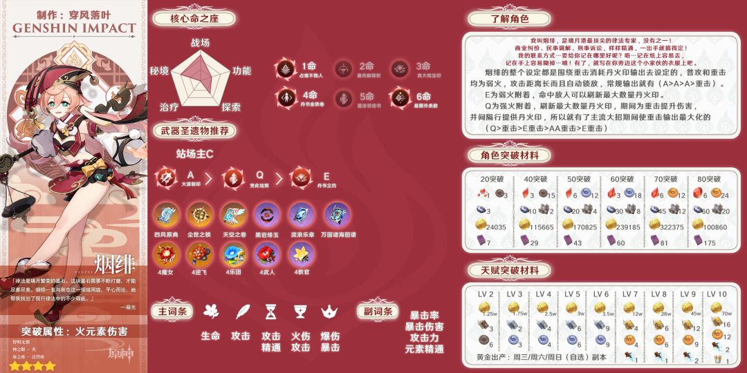 咳咳~还不快抽我?你犯法了你知道吗?(雾 UID: 101407402 1.5版本更新后伴随着钟离祈愿池增加的一名四星璃月新角色“烟绯”。 首先烟绯作为第一个四星火元素法师,她的定位是一个几乎没有辅助能力的角色,所有的天赋以及命座定位都是提高站场伤害的,所以对没有输出角色的玩家很推荐培养使用,因为烟绯的实战效果确实不错,非常值得没有强力火C的玩家抽取。 优点:全火元素伤害,突破增加火元素伤害,攻击