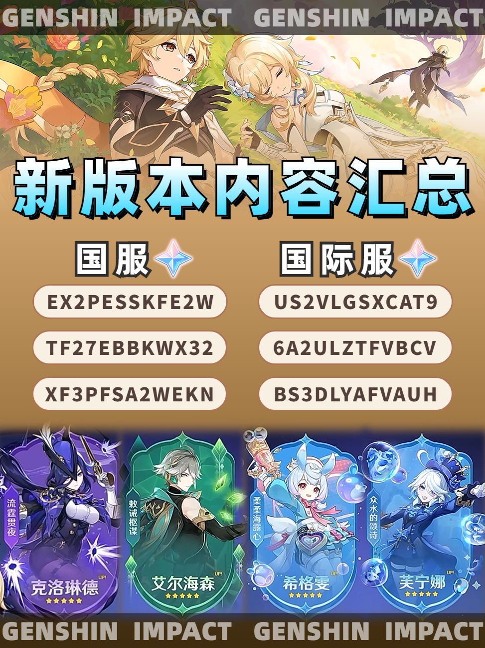 当周年庆碰上5.0会产生怎样的火花?废话不多说,这期来快速为大家介绍一下此次纳塔版本的相关信息,2分钟看完新情报~ 一、300原石 国服:XX3PD82ZYDGN、9FJ7U83HYDJA、5WJNV92GGUJW国际服:2SMTYV59TLFD、7SMTGV59BLXH、8T4TGDLRA5E5二、卡池安排【限定卡池】上半场,玛拉妮、枫原万叶、卡奇娜;下半场,雷电将军、基尼奇。 【玛拉妮,5星水