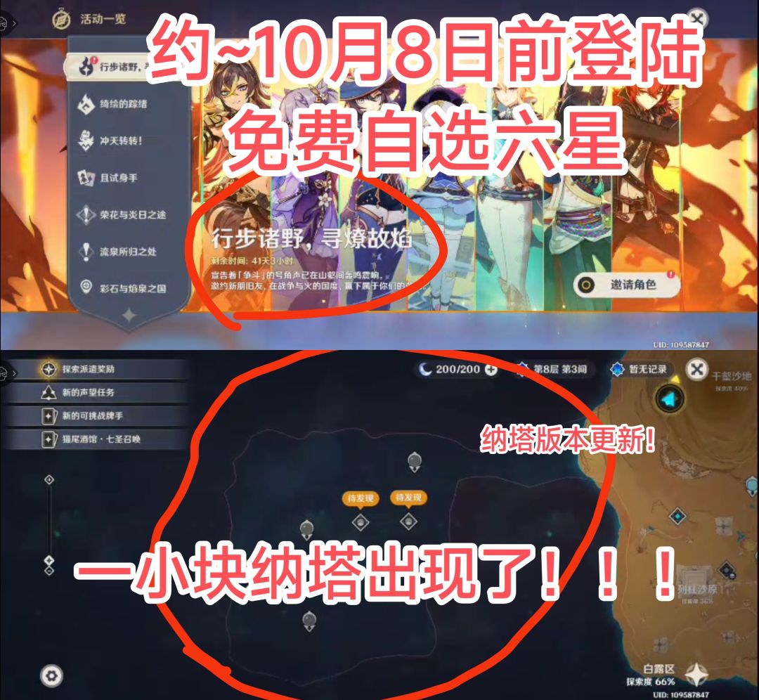 🎉🎉🎉🎉🎉原神,纳塔版本更新🎉🎉🎉🎉🎉 →最佳入坑/回归版本 ✅纳塔世界开放新世界机制,解谜机制 ✅邮箱登陆1000原石 ✅58冒险等级开放,,,世界九 ✅自选一个(常驻)五星,截止大概是约10月8日前登陆领取❗❗❗ 仅三个推荐 1缺少C输出选,草系提那里 2缺少大世界舒服的自动回血大剑/坦克,火系迪希雅 3想整活其他机制/缺奶妈,风系琴 ✅自选2固定词条圣遗物,(但是需要极其强大的资源兑换,20